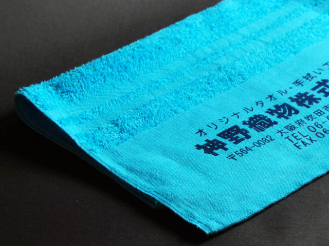 名入れタオルも顔料インクでの加工となります。よく年始用の挨拶用タオルや温泉旅館などで見かけるオリジナルタオルです。主に販促やノベルティに使われ、一般的には名入れタオル(名前入りタオル)と呼ばれています。紺1色の印刷が主流ですが、デザイン次第ではオリジナルのおもしろい表現もできます。(2色まで可能です)生地端(平地部分)にしかプリントできませんがその分料金も安く、泉州産タオルを使用しているため、吸水性もよく、機能的なタオルです。
